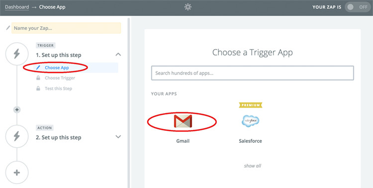 En la imagen que puedes ver arriba, Zapier te pide que escojas en qué aplicación sucederán los eventos que quieres usar como trigger. En este caso, nuestra aplicación trigger es Gmail.
