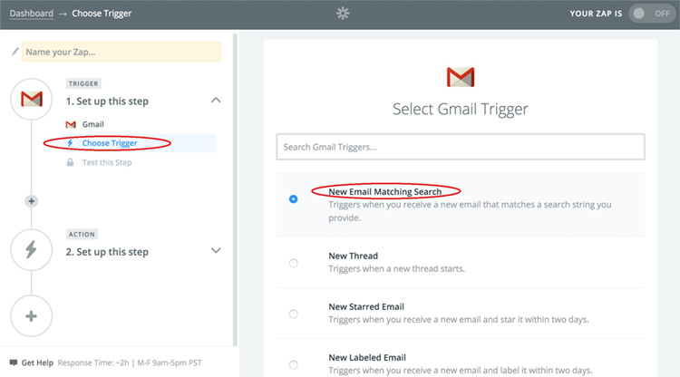 A continuación, Zapier te preguntará qué evento va a ser tu trigger. Para seguir con el ejemplo, vamos a escoger la opción “New Email Matching Search”.