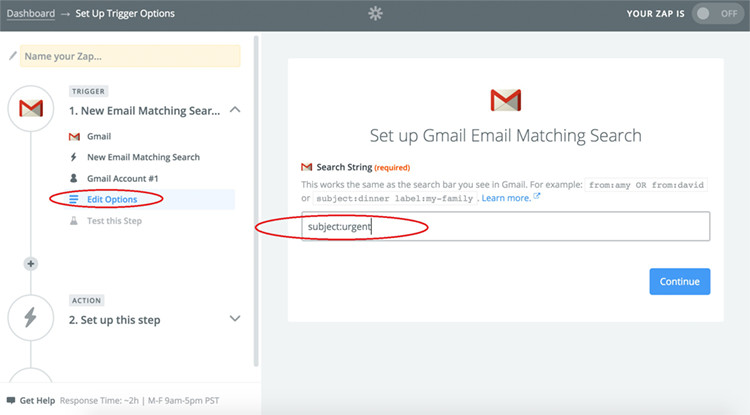 El siguiente paso será configurar qué tipo de emails van a actuar como trigger e iniciar la respuesta automática. Para este ejemplo hemos elegido que sea cualquier email que contenga la palabra “urgente” en el asunto. Cuando termines con este paso, haz clic en “Continue”.