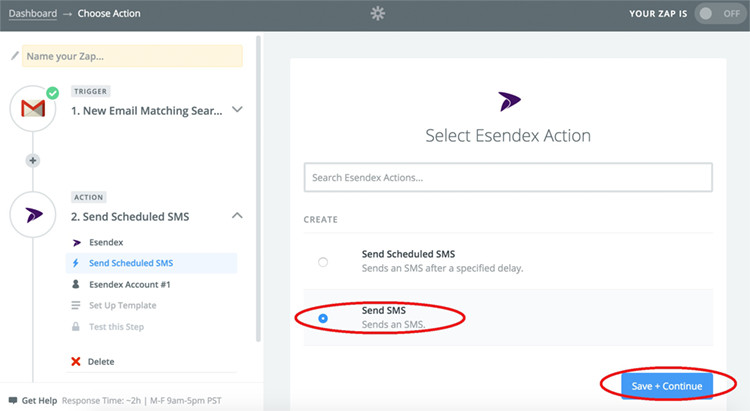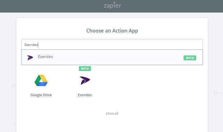 A continuación, selecciona la aplicación que va a dar la respuesta automatizada a tu trigger. Escribe Esendex en el buscador y selecciona nuestra aplicación para poder enviar SMS desde tu cuenta.